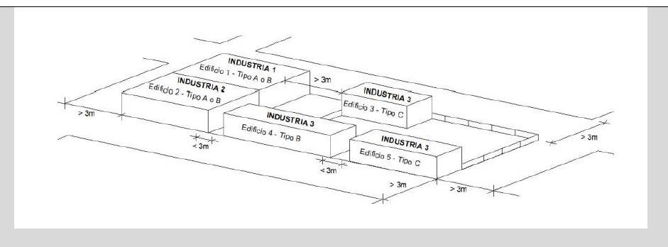 3) “Industria 1″ no es tipo “C” porque, aunque está a más de 3m respecto de «Industria 3”, está pegada a «Industria 2».