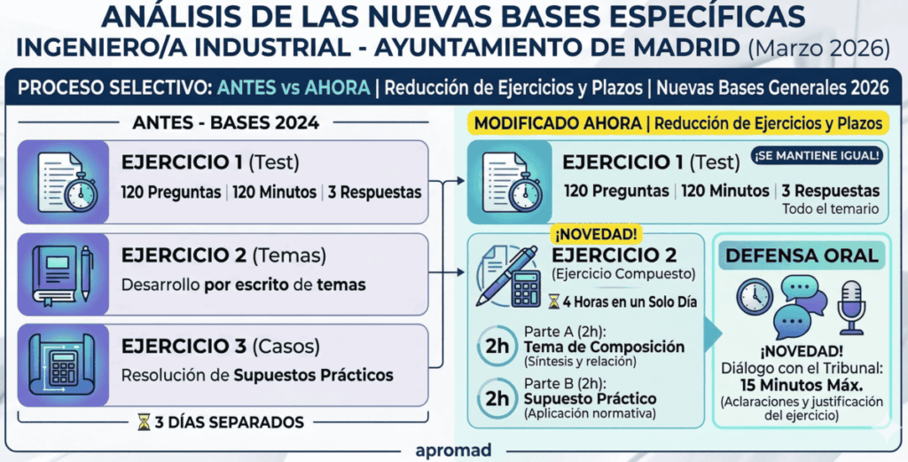 Hoy 19 de marzo de 2026, el Boletín Oficial del Ayuntamiento de Madrid (BOAM núm. 10.089) ha publicado la resolución que aprueba las nuevas bases específicas para la convocatoria de plazas de Ingeniero/a Industrial del Ayuntamiento de Madrid, en turno libre.